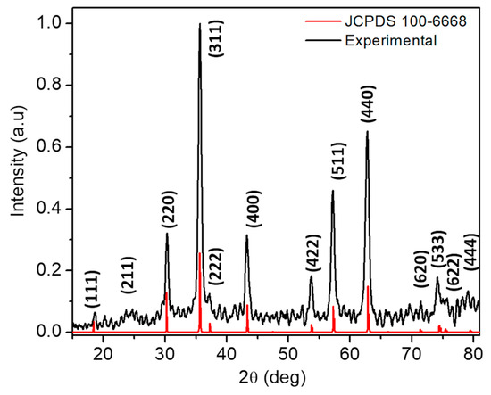 The diffractogram of the powder product without substrate (Figure 1) shows peaks located at angular positions of 18.4°, 24.8°, 30.2°, 35.6°, 37.4°, 43.3°, 53.7°, 57.2°, 62.8°, 71.4°, 74.2°, 75.6°, and 79.3° 2θ indexed to the planes (111), (211), (220), (311), (222), (400), (422), (511), (440), (620), (533), (622), and (444) of Fe3O4 (magnetite), which has a cubic structure with space group Fd-3m (JCPDS #100-6668) [24]. Using the Debye–Scherrer equation [25] and measuring the FWHM of the (311) peak, the crystallite size was determined to be 18.5 nm. No characteristic peaks of other iron oxides were observed in the XRD pattern.