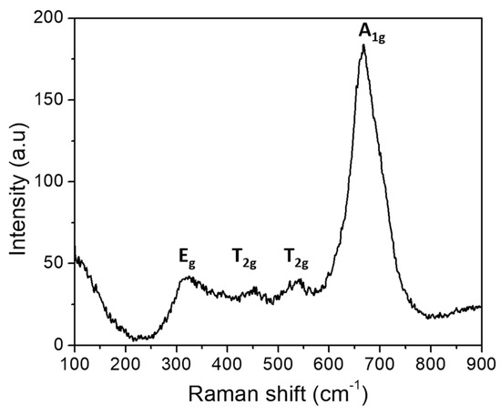 Raman spectra were recorded to confirm the presence of magnetite. Figure 2 illustrates the spectrum for the iron oxide film deposited on the silicon wafer, which showed three prominent bands at 310, 460, 530, and 666 cm−1 associated with the vibration modes Eg, T2g, T2g, and A1g of magnetite [26]. All bands can be attributed to Fe-O lattice vibrations. Furthermore, the A1g band is broad and prominent, as is characteristic of magnetite [27].