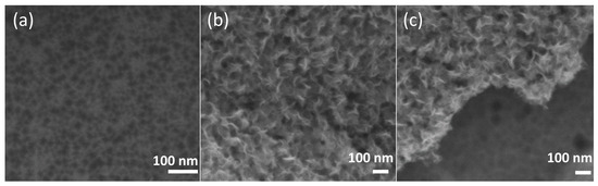 Figure 3 shows SEM micrographs of the silicon chip coated with iron oxide. This technique corroborates that iron oxide is obtained in nanometric size. One can conclude that by carrying out a single-step synthesis process, the nanostructures can be deposited on a Si current collector to be used as an electrode in a supercapacitor. Figure 3a is a micrograph of a chemically treated Si chip; it can be seen that pores of about 55 nm are formed and are evenly distributed on the Si surface. Figure 3b,c show micrographs that indicate that a uniform coating of iron oxide particles is deposited on the Si substrate. The particles have a nano-wall shape. Such a large-surface-area shape is promissory for enhanced electrochemical performance [28]. The growth and distribution of the iron oxide particles coincide with the size and distribution of the nanopores in the silicon wafer. This indicates that the pores at the surface of the Si chip served as a nucleation point for the iron oxide, influencing its size and shape.
