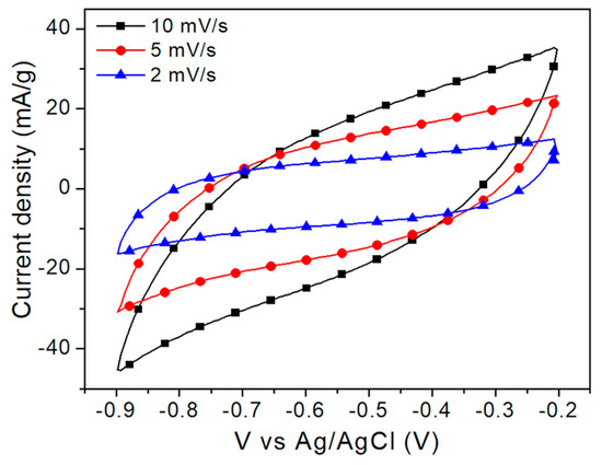Cyclic voltammetry tests were performed using a three-electrode cell to determine the iron oxide processes when used as a supercapacitor’s electrode. Figure 4 shows the voltammograms belonging to the Fe3O4 films in a Na2SO4 [1 M] aqueous solution at the rates of 2, 5, and 10 mVs−1 in a potential window of −0.9 to −0.2 V. An increase in the width of the graphs when increasing the rates and a well-defined rectangular shape can be attributed to the simultaneous occurrence of faradaic and non-faradaic processes to store energy [29]. At higher rates (Figure S1), a large ohmic contribution to the total current can be observed (the slope of the curves is large).