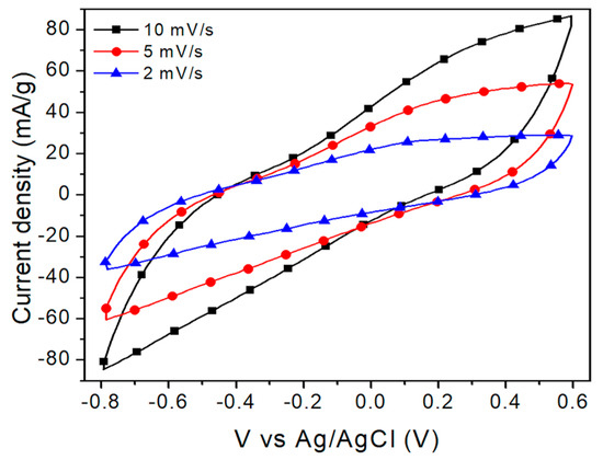 Figure 6 shows the voltammetric responses obtained at different scan rates from 2 mVs−1 to 10 mVs−1. In all cases, the potential sweep initiates negatively concerning the zero-current potential. It is observed that at slower scanning rates, the electrode’s response as a supercapacitor is better. A semi-rectangular shape is observed, but a faradaic peak can be observed even at rates as high as 10 mV/s at about 0.15 V. The electrochemical performance of the electrodes highly depends on the physicochemical properties of the electrolyte, such as molar conductivity and ionic mobility [38]. The current density observed with KCl is larger than with Na2SO4, probably due to the higher ionic conductivity of the KCl solution (probably because it has a higher concentration).