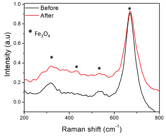 Ex situ Raman spectra of Fe3O4 film before and after the CV cycles in [3 M] KCl.