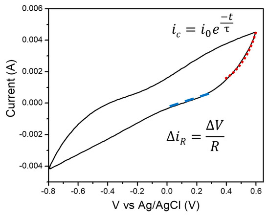 To calculate the capacitance of the supercapacitor assembly being evaluated, Equation (3) was used, which describes the typical relaxation time (τ) of a capacitor with capacitance C in parallel with a resistor with resistance R. Any real capacitor presents conduction current, whose existence can be modeled with R. The values of τ and could be obtained from the current components that can be observed in the voltammogram of Figure 8. The exponential line represents mainly a capacitive current (ic) since it is at least one order of magnitude larger than the ohmic current in the marked current section. By fitting that curve section with Equation (4) and changing the x-axis by time, τ can be calculated. Here, t is the time, and i0 is the current at time t = 0. This fit is correct if performed at voltages at which redox contributions to the current are minimum (where no peaks are observed). Finally, the linear line represents an ohmic current (iR), from which the resistance can be obtained with Equation (5), where V is the voltage and is the inverse of the discrete derivative of the curve. The whole data treatment to determine the C of a supercapacitor can, from now on, be known as Quiroga’s method.