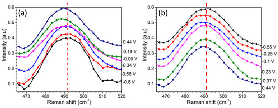 Raman spectra were recorded while performing cyclic voltammetry in the range of −0.8 to 0.6 V at a rate of 5 mVs−1. The band at 490 cm−1, corresponding to the γ -Fe2O3 (maghemite) phase [54], is the one that suffers the largest changes, as can be observed in Figure 9. No apparent changes could be observed in other bands (see Figure S3). As a shoulder at about 510 cm−1, it is possible to identify Fe3O4 (magnetite) [18]. Interestingly, as the voltage goes to positive values, the band moves towards maghemite, while it moves towards magnetite when going back to negative values. A vertical dashed line is drawn in Figure 9 in order to easily observe this shift. The observed phenomenon can be explained in the following way: when the voltages go positive, the chlorine ions are attracted to the surface of the electrode, and they cannot only form a double-layer electrochemical capacitor but they can also be allocated inside the iron oxides, as elucidated from the voltammetry tests. Such an effect has been observed in studies of chlorinated water in iron pipes. In the presence of chlorine, ferrous oxides are transformed into ferric oxides, and the residual chlorine is consumed in the process [55]. Actually, Fe is partially in ferrous form (2+) in magnetite, and it is in ferric form (3+) in maghemite. The shift may be enhanced due to the stress induced by the incorporation of chlorine. It is known that when there is tensile stress (as occurs when introducing chlorine into the structure), there is a red shift of the Raman bands, and when there is compressive stress (as occurs when releasing chlorine), there is a blue shift [56]. It is remarkable that the process is reversible in the present study.