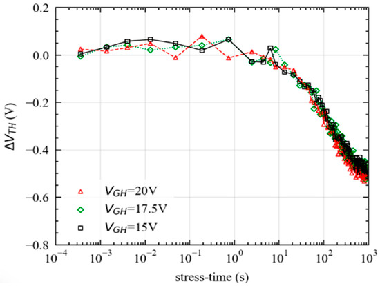 The influence of high gate voltage (VGH) on threshold voltage (Vth) was studied by [34], where the gate voltage was changed from −5 V to three different levels: 15 V, 17.5 V, and 20 V. At the same time, the drain voltage was maintained at 100 volts. This study helped to clearly understand how varied gate voltage levels affect Vth over time, as shown in Figure 3.