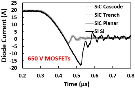 Traditionally, this problem is solved by implementing a silicon carbide (SiC) Schottky barrier diode (SBD). In comparison to other diodes, this one has a lower forward voltage and a faster recovery time [54,55]. By adding an SBD, the system’s flyback current management pathway is diversified, hence reducing the body diode’s deterioration. Figure 5 [37] compares the reverse recovery properties of 650 V SiC planar, trench, and cascode devices to a silicon super-junction MOSFET. The SiC MOSFETs show superior body diode performance, with a decreased peak negative current. Overall, SiC devices perform better than silicon SJ MOSFETs, but the best option depends on the application’s switching frequency.