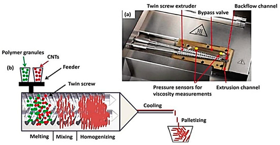 Melt mixing, also known as melt compounding, is a widely adopted technique in the polymer industry for producing PS/CNT composites. In this method, PS pellets are melted at elevated temperatures, typically between 180 °C and 220 °C, within an extruder. CNTs are then introduced into the molten polymer, and the mixture is subjected to high shear forces, promoting the dispersion of CNTs within the polymer matrix. The molten composite is then extruded into a desired shape, which can further be processed using techniques like injection molding or compression molding (Figure 1) [18,37].