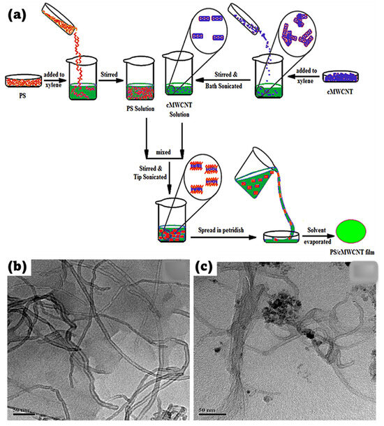 Erkmen et al. [42] found that PS-based composites reinforced with silane-modified CNTs and prepared via masterbatch dilution showed a 33% increase in tensile strength and 34% increase in modulus compared to melt mixing. Masterbatch dilution also reduced electrical resistivity. Both methods achieved 100% shape recovery in under 30 s during electrically actuated bending tests, highlighting improved thermal and electrical conductivity. In another study, Parnian and D’Amore investigated PS/CNT nanocomposite films prepared using solution mixing and the doctor blade technique [21]. They found that conductivity became unmeasurable with increasing CNT content in dilute PS solutions, while higher PS concentrations led to increased conductivity up to a threshold before decreasing, explained partly by PS–THF viscosity data. Sen et al. [43] demonstrated that incorporating carboxylic acid functionalized multi-walled carbon nanotubes (cMWCNTs) into polystyrene (PS) via solution blending significantly enhanced the nanocomposite (NC) films’ thermal stability, rheological properties, and hardness. Figure 2a shows the preparation process for PS/cMWCNTs composite film. Fourier transform infrared spectroscopy (FTIR), Raman spectroscopy, and X-ray diffraction (XRD) confirmed the strong interaction between the PS matrix and the cMWCNTs, which contributed to these improvements. Thermogravimetric analysis (TGA) showed that the well-dispersed cMWCNTs increased the thermal degradation resistance of the NC films, with higher activation energy and procedural decomposition temperature. Figure 2b,c show the TEM analysis of PS nanocomposite surfaces, specifically for samples with PS concentrations of 0.3% and 0.5%, revealing a strong interfacial interaction between the PS matrix and the carbon nanotubes (CNTs), which appeared embedded and coiled within the matrix. The micrographs showed that the nanotubes, with diameters ranging from 12 to 20 nm, were uniformly dispersed in the matrix at the lower PS concentration (0.3%) (Figure 2b). However, at the higher PS concentration (0.5%) (Figure 2c), some regions displayed aggregated CNT masses, indicating less-uniform distribution. Despite these aggregates, the overall nanotube dispersion was still good, aligning with previous findings in similar composites.