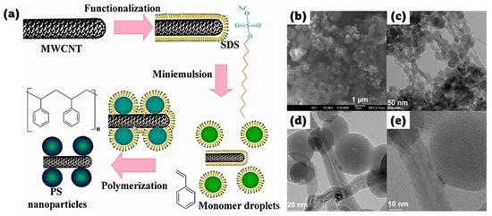 (a) Schematic of the multistep process for functionalizing MWCNTs with PS nanoparticles via in situ microemulsion polymerization. (b) SEM and (c–e) HRTEM images of MWCNT/PS nanoparticle composites synthesized through in situ microemulsion polymerization. Reused with permission from [46].