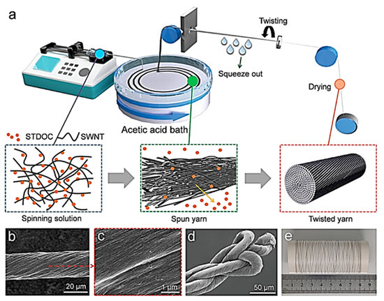 Wet spinning is a traditional technique primarily used to produce fibers or filaments from PS/CNT composites. In this method, a solution of PS and dispersed CNTs is extruded through a spinneret into a coagulation bath containing a non-solvent. The non-solvent causes the polymer to precipitate, forming solid fibers that are collected and dried. These fibers can then be drawn to improve their mechanical properties [48]. Farha et al. [49] developed a highly densified and multifunctional carbon nanotube (CNT) yarn through wet compression using acetone, which serves as a lubricant to reduce CNT interactions and increase packing density. The yarn’s density increased by 120%, from 0.211 to 0.465 g/cm3, while the diameter was controlled at 175 ± 5 μm. This process significantly enhanced the yarn’s tensile strength, modulus, electrical conductivity, and gauge factor by 185%, 887.5%, 105%, and 305%, respectively. Additionally, the CNT yarn exhibited excellent electrothermal stability, reaching 275 °C in 15 s and maintaining performance under bending and knotting, making it suitable for smart textiles, wearable electronics, and fabric heaters. Zhao et al. [50] developed a rapid and continuous twisting wet spinning method for producing highly densified CNT yarns. This process involved dispersing CNTs in a surfactant solution, removing the surfactant in a coagulation bath, and applying twisting to improve yarn density and CNT alignment. The resulting CNT yarns exhibited a tensile strength of 600 MPa, a Young’s modulus of ≈40 GPa, and high conductivity of 8990 S cm−1. Additionally, the CNT yarn demonstrated an ultra-fast electrothermal response of over 1000 °C s−1 at a low voltage of 5 V, with stable mechanical properties during heating. This scalable approach offers a pathway for producing high-performance CNT yarns for various applications. Figure 4a illustrates the rapid preparation of CNT yarns, completed within minutes. SWCNTs were dispersed in water with sodium taurodeoxycholate (STDOC) and extruded into an acetic acid (HOAc) coagulation bath at 2 mL h−1 for effective coagulation and surfactant removal. The gel-like CNT yarns were then twisted to enhance density Figure 4b,c, exhibiting strong mechanical properties without fractures during manipulation Figure 4d. This efficient process enabled continuous production, as demonstrated by a single CNT yarn exceeding 20 m in length collected on a spool without breakage Figure 4e.