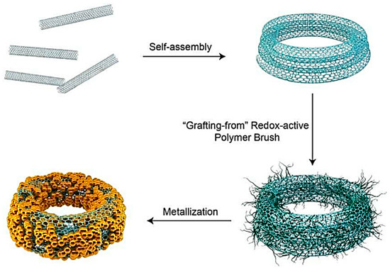 Schematic illustration of the self-assembly of carbon nanotubes (CNT) into CNT rings (CNTR) and the subsequent growth of redox-active poly(4-vinylphenol) (PvPH) brushes via surface-initiated atom-transfer radical polymerization (SI-ATRP) to reduce Au3⁺ to Au0 and coat gold nanoparticles onto the CNTR. Adopted with permission from [60].