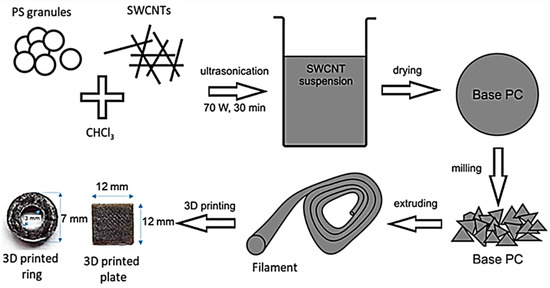 Schematic representation of the preparation process for base composite materials, filaments, and 3D-printed samples derived from polystyrene (PS) and single-walled carbon nanotubes (SWCNTs) [62].