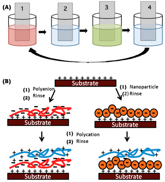 (A) Schematic of the layer-by-layer (LBL) film deposition process: Steps 1 and 3 illustrate the adsorption of the polyanion and polycation, while steps 2 and 4 represent the washing stages. (B) Two adsorption pathways show LBL deposition for polymers alone and for polymers with nanoparticles (NPs) [53].
