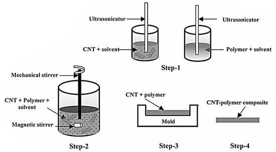 Schematic of the solvent casting process using a co-solvent method for the preparation of carbon nanotube (CNT)–polymer composites. Adopted with permission from [70].