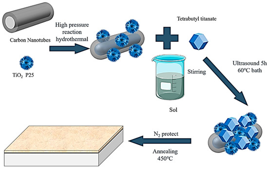 Schematic illustration of the formation of mesoporous TiO2/CNT nanomaterial membranes using the sol–gel method with ultrasonic irradiation [75].
