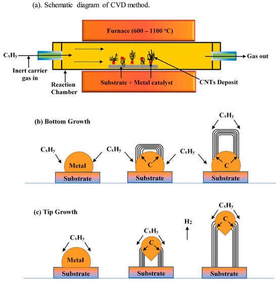 (a) Schematic diagram of the CVD method. (b) Growth mechanism of carbon nanotubes through bottom growth. (c) Growth mechanism of carbon nanotubes through tip growth. Reused with permission from [82].