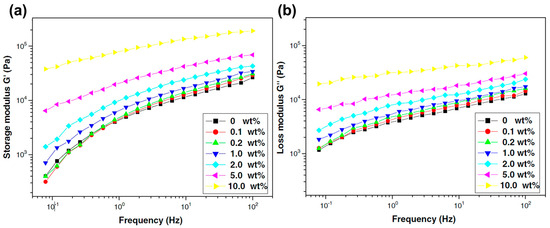 In addition to dispersion, polymer–CNT entanglement significantly influences the composite’s mechanical and rheological properties [35]. The interaction between polymer chains and CNTs creates a reinforcing effect, improving stress transfer, toughness, and impact resistance. Another crucial factor is CNT concentration as it dictates the rheological state of the composite. At low concentrations, CNTs remain individually dispersed in the matrix, exhibiting viscosity scaling that deviates from Einstein’s classical 2.5 factor due to their pronounced shape anisotropy. However, above a critical threshold (~2–3 wt.%), CNTs form a percolated network where entanglement and inter-tube interactions become dominant, leading to a transition from a viscous-liquid rheology to an elastic gel-like state. The storage modulus (G′) in such systems exhibits a plateau at low frequencies, characteristic of weakly elastic networks. The transition between colloidal glass-like jamming at short mixing times and the formation of a rheological stable entangled CNT network at longer times suggests an interplay between nanotube interactions, dispersion kinetics, and polymer matrix rheology [34,36].