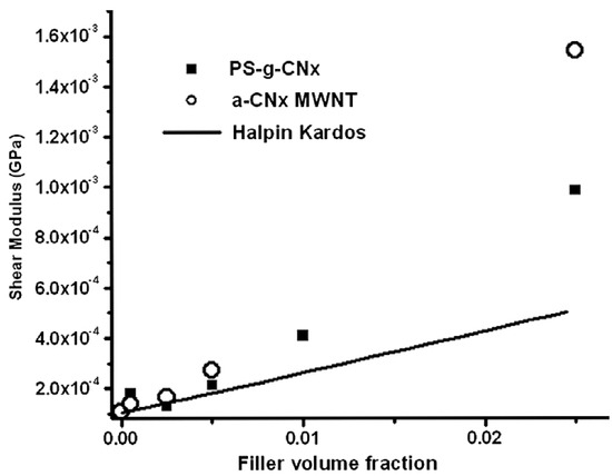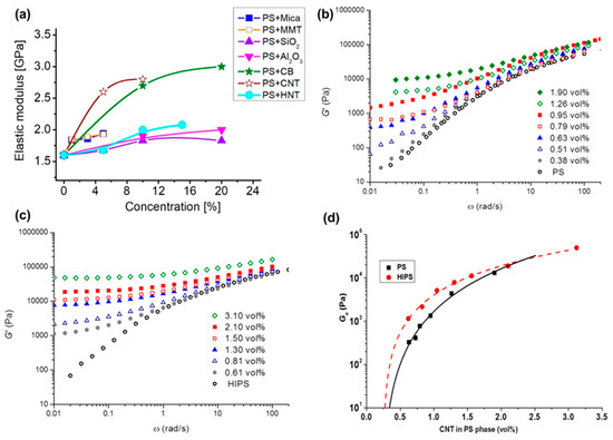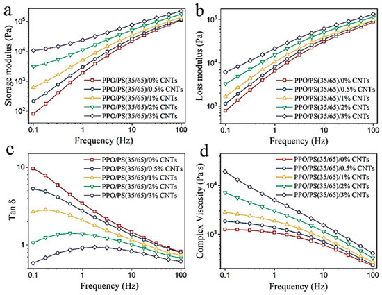 The addition of CNTs to PS significantly alters both the rheological properties and functional performance of the composite. From a rheological standpoint, the presence of CNTs introduces a network-like structure within the polymer matrix, which impacts the flow behavior of the composite during processing. At low CNT concentrations, the composite behaves like a typical polymer, with Newtonian flow. As CNT content increases, shear thinning behavior becomes more prominent due to the formation of CNT networks that restrict polymer chain mobility. This results in a notable increase in the viscosity and elasticity of the PS/CNT composite. The extent of these changes is highly dependent on the CNT loading, aspect ratio, dispersion quality, and interactions with the polymer matrix [16]. Dynamic rheological measurements show that the storage modulus (G′) and loss modulus (G″) of PS/CNT composites increase with CNT incorporation, indicating a shift towards more solid-like behavior [17]. The onset of this change correlates with the formation of a CNT network, which imparts structural integrity and reduces the ability of the polymer to flow under stress. At high CNT concentrations, this network structure alters the viscoelastic properties, increasing the composite’s resistance to deformation and better processability during molding and extrusion. The synergistic effect between CNTs and PS creates multifunctional composites with properties that extend well beyond those of the base polymer. The rheological changes induced by CNTs during processing are closely linked to the enhancements in the mechanical, electrical, and thermal performance of the material. As such, CNTs not only improve the composite’s strength and conductivity but also optimize its processability, enabling the production of more complex and durable components in a wide range of industries, including aerospace, automotive, electronics, and packaging [18,19].
