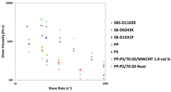 The integration of carbon nanotubes (CNTs) into polymer matrices has revolutionized the field of material science, leading to the development of advanced composites with exceptional properties due to their unique cylindrical nanostructures composed of rolled-up graphene sheets, exhibiting extraordinary mechanical, electrical, and thermal properties. Polystyrene (PS), an extensively used thermoplastic polymer, is valued for its low cost, ease of processing, excellent electrical insulation properties, and chemical resistance, making it suitable for a wide range of applications from packaging materials to electronics. However, despite these advantages, PS has significant limitations, including relatively low mechanical strength, poor thermal stability, and limited electrical conductivity, which restrict its use in more demanding applications. To overcome these limitations, the incorporation of CNTs into PS matrices imparts remarkable mechanical reinforcement, improving thermal conductivity and electrical conductivity due to their high aspect ratio, strength, and conductive nature, making them highly suitable for demanding applications in aerospace, electronics, automotive, packaging, and other industrial sectors [3,4,5]. Rheology, broadly defined as the study of the deformation and flow behavior of materials, encompasses both liquid-like (viscous) and solid-like (elastic) responses, making it essential for understanding the behavior of polymer composites [5]. In the context of this review, the term “rheological properties” refers to key parameters such as viscosity, elasticity, shear-thinning behavior, storage modulus, and loss modulus, which dictate the processability and performance of CNT/PS composites. The addition of CNTs substantially alters the rheological behavior of the composite, such as increased viscosity, modified elasticity, and altered shear-thinning characteristics. These rheological changes have critical implications for the processing and ultimate performance of the material. In aerospace and automotive applications, where material strength and reliability are paramount, increased viscosity and elasticity can contribute to the development of stronger and more resilient components [6]. However, these same properties may complicate processing, requiring advanced techniques to achieve uniform CNT dispersion and prevent defects that could undermine the material’s integrity. In electronics and packaging, where precision and consistency are crucial, understanding and controlling these rheological properties is essential to ensure that the composites perform as intended. Therefore, a comprehensive understanding of the rheological behavior of CNT/PS composites is indispensable in their design and fabrication as it directly influences processability, performance, and reliability across these diverse and demanding applications [5,6,7].