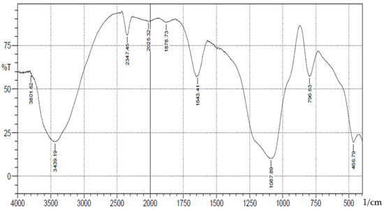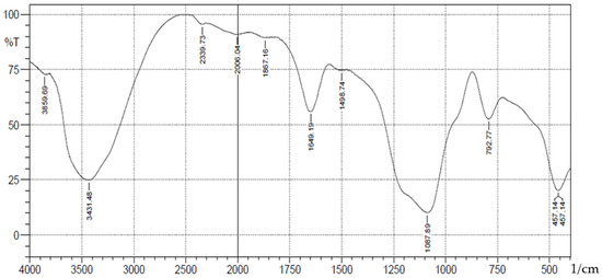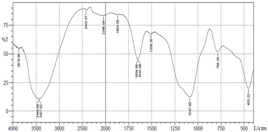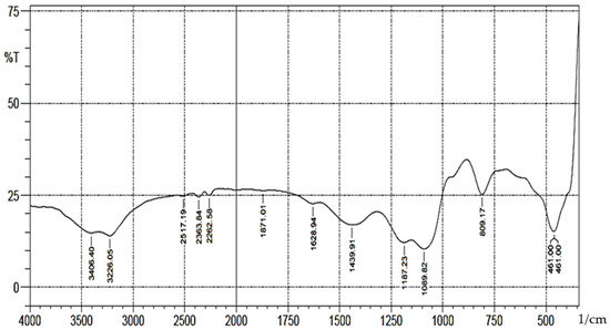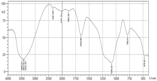A schematic representation of synthesis of the Schiff base is shown in Scheme 1. The FT-IR spectra (Figure 1) showed absorption bands at 3406–3226(b), 1089(vsp), 809(m) and 461(s) cm−1 corresponding to stretching vibrations of silanol -OH, asymmetric stretching vibration of Si-O, symmetric stretching vibration of Si-O-Si, and asymmetric Si-O-Si bonding, respectively. After immobilization with 3-aminopropyl trimethoxy silane (APTS) and salicylaldehyde, other characteristic vibrational frequencies corresponding to more functional groups are visible. The bonding of Cd (II) and Cr (II) ions unto silica and functionalized silica are in Figure 2, Figure 3, Figure 4 and Figure 5, respectively.