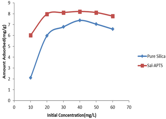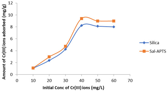 Chromium (iii) ions removal by pure and modified silica (Sal-APTS) at different initial concentrations.
