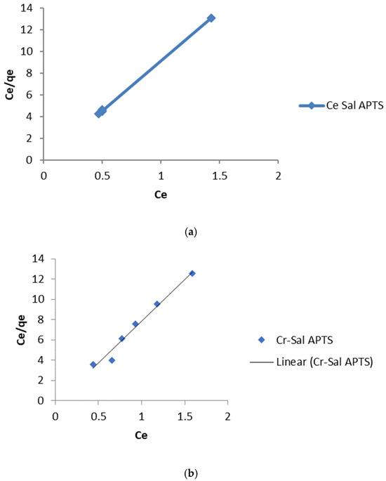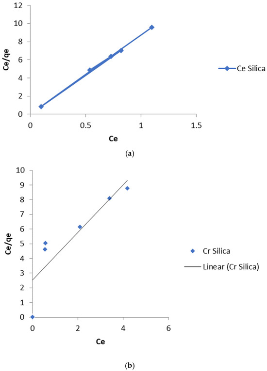 The linear plot of Ce/qe vs. Ce should yield a straight line if the Langmuir equation is obeyed by the adsorption equilibrium. The constants KL and qmax are obtained from the intercept and slope of the linear plots (Figure 8a,b and Figure 9a,b).