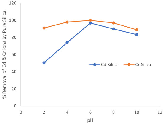 Variation of % removal of Cd and Cr ions with pH unto pure silica.
