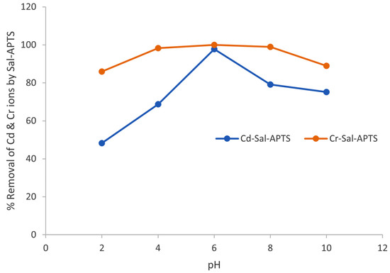Variation of % removal of Cd and Cr ions with pH unto Sal-APTS.