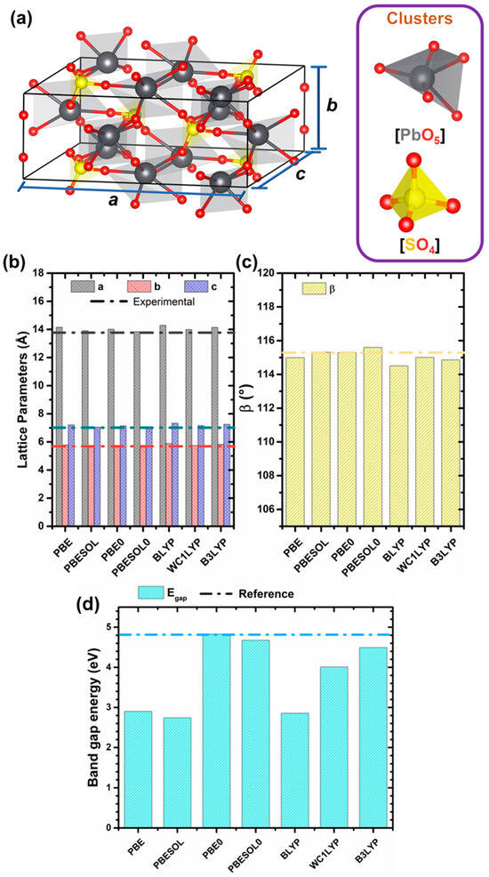 (a) Bulk structure unit cell and its constituting clusters, (b) lattice parameters, (c) β (angle between a and c), and (d) band gap energy variations in function of density functional. Dashed dotted line represents reference values for each parameter [].