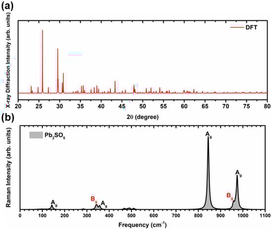 This study also evaluated the spectroscopic properties of the optimized structure calculated at the PBE0 level through Raman spectroscopy and XRD, as they provide chemical and structural fingerprints for the monoclinic PSO structure. Figure 2a,b show the XRD patterns and the simulated Raman spectra of the PSO structure. Furthermore, the results are similar to those obtained experimentally and are more pronounced at lower angles []. Moreover, PSO has 24 active Raman modes, of which only 6 are the most relevant and intense, as shown in Figure 2b. These intense modes are located at 142.95 cm−1 (Ag, high lead rocking and small sulphur wagging), 344.85 cm−1 (Bg, lead rocking and sulphur scissoring), 357.11 cm−1 (Ag, lead and sulphur symmetrical stretching), 844.55 cm−1 (Ag, sulphur symmetrical stretching), 957.91 cm−1 (Bg, sulphur asymmetrical stretching), and 974.43 cm−1 (Ag, sulphur asymmetrical stretching and wagging). A video animation of the vibrational Raman-active mode movements is provided in the Supplementary Material.