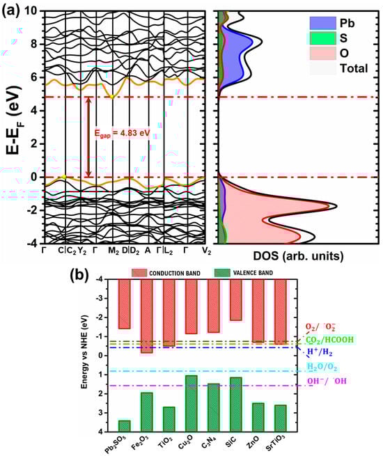 (a) Band structure of PSO in high-symmetry path in Brillouin zone and its density of states (DOS) and (b) band edge positions for PSO (our work) and for other materials [,].