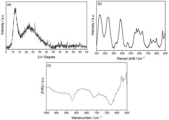 The XRD pattern of the synthesized material, shown in Figure 1a, reveals broad, diffuse scattering features with a dominant intensity maximum centered at approximately 2θ ≈ 22.5°. This characteristic profile is indicative of an amorphous or poorly ordered phase, where long-range crystallographic periodicity is either absent or significantly disrupted. The presence of this diffuse halo suggests that the material possesses a predominantly amorphous character at the atomic scale, likely resulting from rapid quenching or non-equilibrium synthesis conditions [14]. Superimposed on this amorphous background, several sharp Bragg reflections are observed at 2θ ≈ 11°, 26°, 36°, 38°, 43°, 45°, 46°, 51°, 53°, and 60°, which correspond to the (001), (101), (012), (111), (112), (013), (200), (113), (104), and (114) planes, respectively, of titanium nitride chloride (TiNCl), as a JCPDS card #18-1399. The coexistence of these well-defined crystalline peaks within the amorphous matrix confirms the presence of nanocrystalline domains embedded in a disordered phase, indicating a composite microstructure composed of both ordered and disordered regions. Such dual-phase systems are often associated with enhanced functional properties, including improved mechanical strength and tailored electrical conductivity, due to the synergistic effects between crystalline and amorphous domains.