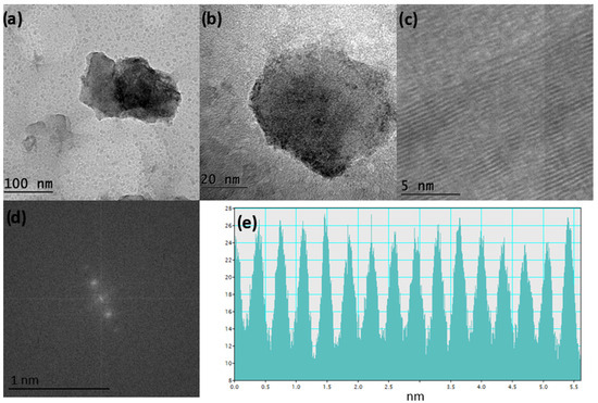 To gain deeper insights into the microstructural characteristics of the synthesized material, representative TEM images, shown in Figure 2a,b, reveal the presence of thin, plate-like structures with high electron transparency under a 200 kV accelerating voltage. This observation indicates that the material possesses a lamellar morphology with a thickness on the nanometer scale, which is consistent with the formation of two-dimensional nanostructures. Such morphology is often associated with improved stability during electron microscopy, as the reduced thickness minimizes beam-induced artifacts and allows for more reliable imaging.