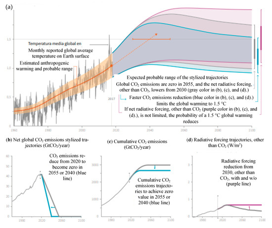 Global warming has become more of a social concern in recent decades than a scientific topic. Governments, private companies, social organizations, and people are concerned by climate change and the natural disasters caused by global warming. Anthropogenic emissions of greenhouse gases (GHGs) since the preindustrial era have caused an increase of 1 °C in global average temperature. The Intergovernmental Panel on Climate Change (IPCC) has concluded that global warming will increase by up to 1.5 °C between 2030 and 2050 if the current rate of GHG emissions continues. Within the GHGs, carbon dioxide, or CO2, is the most notorious gas, accounting for 78% of total emissions in 1970–2010. The Intergovernmental Panel on Climate Change (IPCC) published a report showing an average 1 °C temperature increase on Earth due to anthropogenic emissions of greenhouse gases (GHGs) growing from the pre-industrial era until the present. The report concludes that demographic and economic growth is responsible for global warming within a probable range of 0.8 °C to 1.2 °C [1]. Additional studies, based on the IPCC report, analyze the global warming consequences, including the summary for policymakers, and evaluate the measurements society should apply to revert the phenomenon [2,3,4]. The principal conclusion is an expected 1.5 °C temperature increase on Earth in 2030–2050 if GHG emissions continue to rise.