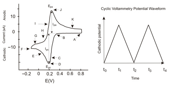 Cyclic voltammetry is one of the most widely used techniques to characterize redox reactions, supplying information about the chemical species and thermodynamic parameters. The sweep voltage derives from a triangular potential variation whose slope absolute value matches the sweep velocity (Figure 2). According to the setup sweep voltage, we obtain a voltammogram for every recorded current peak (Randles–Sevcik equation) [40].