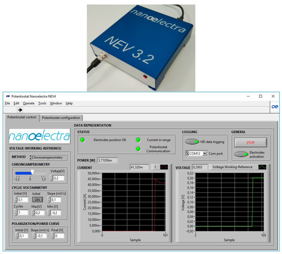We used a potentiostat model NEV 3.2 from Nanoelectra, controlled by software supplied by the manufacturing company [43]. Figure 5 shows the potentiostat and the software control screen.
