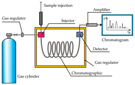 Gas chromatography is the technique applied for methanol identification. We use an inert gaseous flow that drags the generated sample through a heated chamber at a setup temperature. We can identify the sample type by determining the drag volatile component velocity, since in the steady state, the chamber retains the analytes, releasing them at variable velocity depending on their composition [44,45]. Figure 6 shows the schematic view of the process.