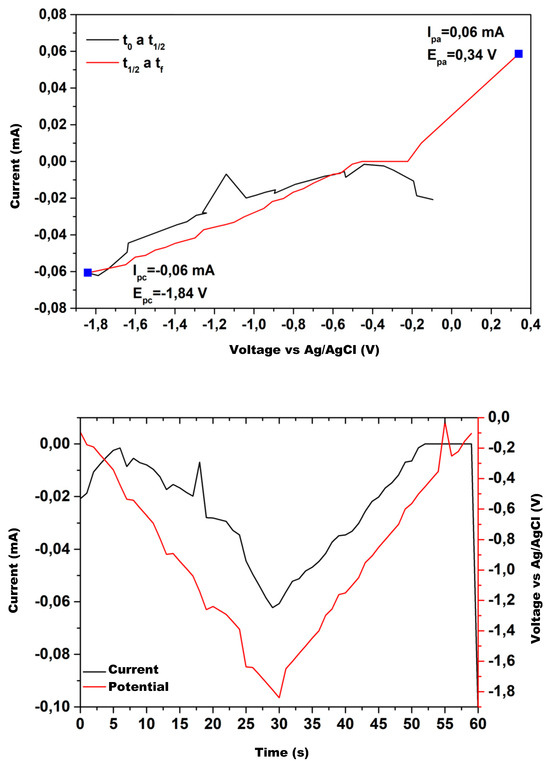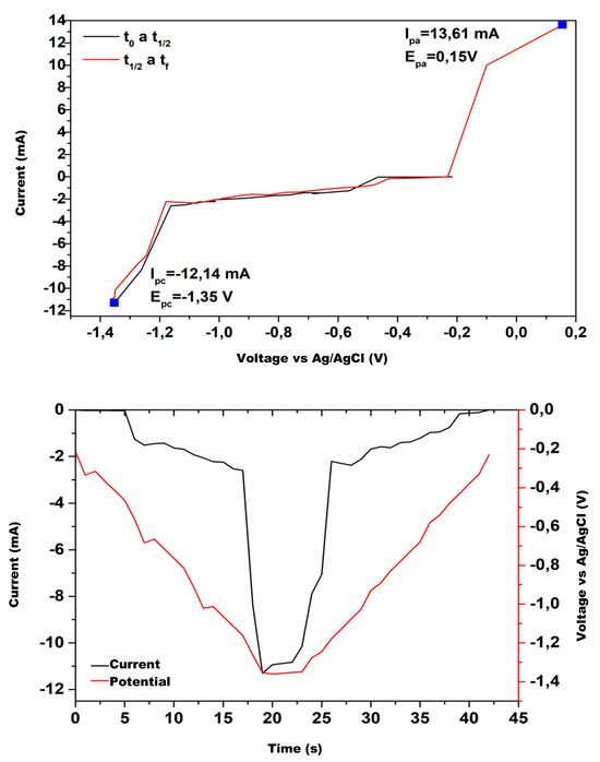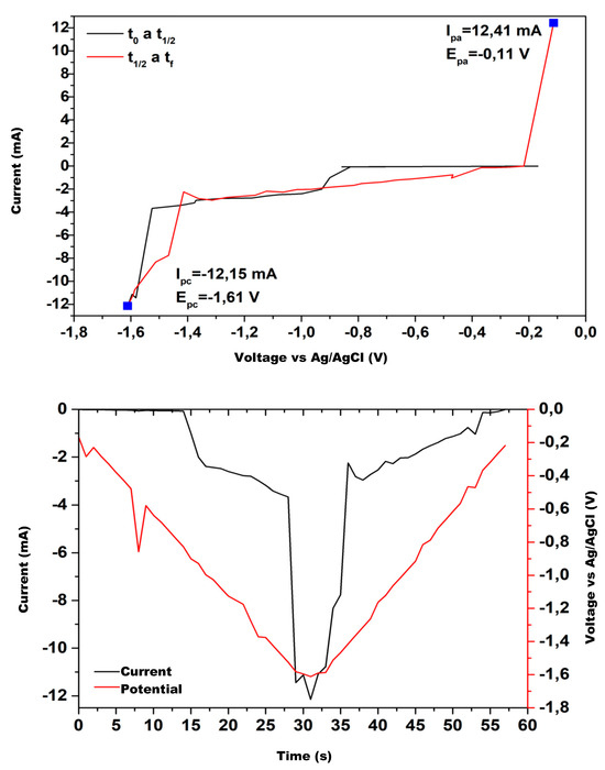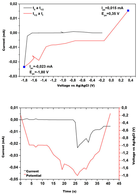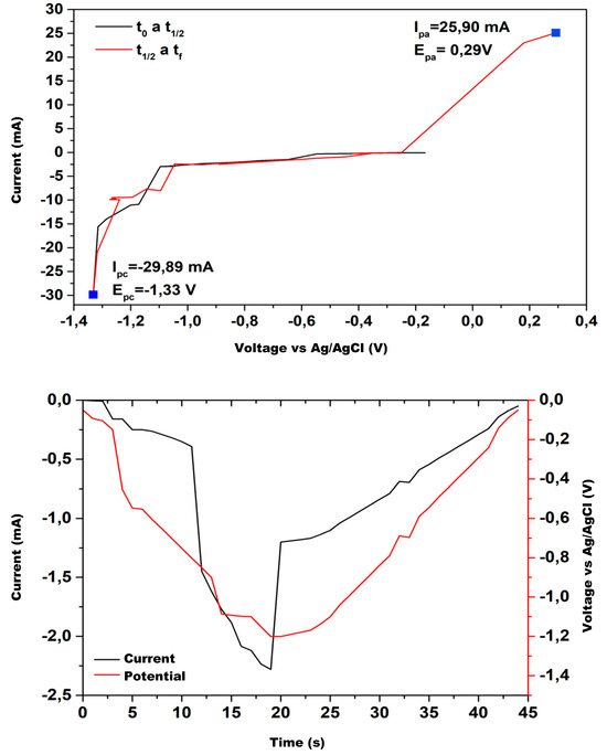 The upper hand side of Figure 7, Figure 8, Figure 9, Figure 10, Figure 11 and Figure 12 shows the electroanalytical response to a programmed voltage evolution regarding the reference electrode (Ag/AgCl). The current evolution is the result of the electrochemical reaction, with a first step representing the concentration gradient effect and a second step where the concentration stabilizes, maintaining a constant density current. If the current continues changing over the entire voltage range, the concentration gradient remains, and the system does not reach a steady state. Low variations in the stabilized current value are acceptable because the system’s redox reactions may provoke slight changes in the concentration at the double layer zone when ions exchange charge with the electrode.
