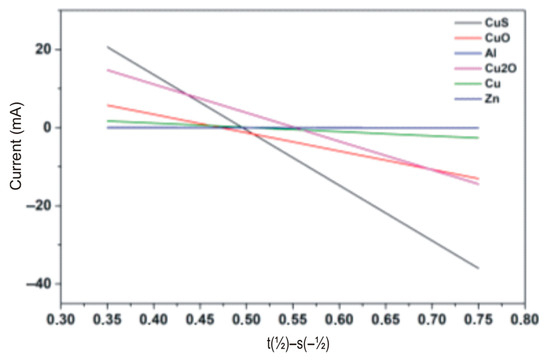 As the process evolves, as shown by the red line, the obtained results show that the copper mixture electrodes, CuS, Cu2O, and CuO, maintain the current values for the same voltage range. The pure copper electrodes tend to reproduce the current evolution but show noticeable differences in the first half of the voltage range. The Zn electrode exhibits a significant difference, and Al does not maintain a constant current at any voltage value.