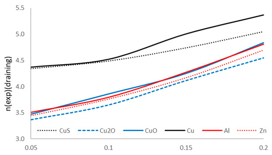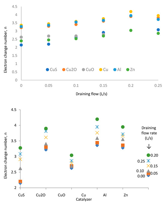 Regarding the data in Table 23, we notice that the draining process extends the reverse reaction starting time, improving the methanol formation performance. On the other hand, the electronic change is modified when using the draining process; Figure 23 shows the evolution of the experimental n-value for the various flow rates and catalyzer types.