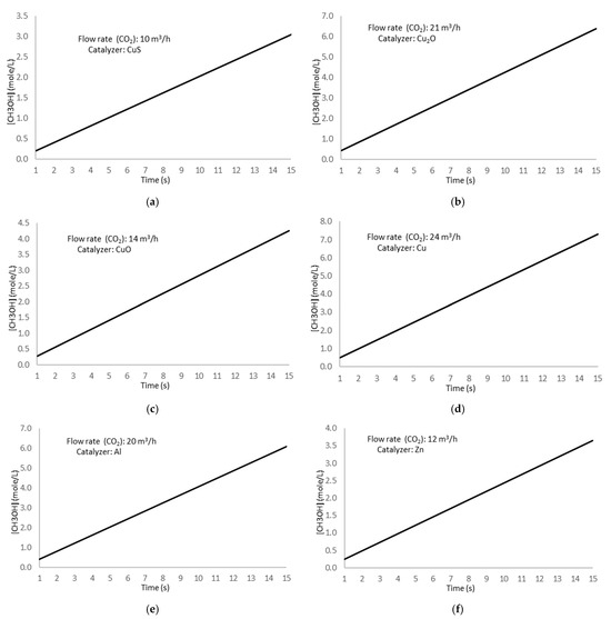 Comparing the time evolution of the methanol concentration under current conditions and using the draining methodology, we notice that this last procedure shows a significant reduction in the methanol concentration in the electrolytic cell solution. This process favors the direct reaction progress and continuous methanol formation and tends to achieve the maximum electron change number and the optimum performance. This situation occurs in all cases with slight differences between the catalyzer types.