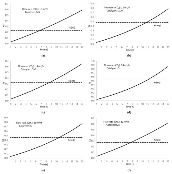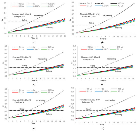 We also notice no significant difference in the Kc performance between different catalyzers, with a slight gap from one to another. Table 15 shows the time the reaction constant, Kc, matches the equilibrium value for the non-draining and draining cases with the different catalyzers. This value represents the point where the methanol decomposition reverse reaction starts. Table 21 also shows the time fraction where the reverse reaction begins, regarding the total time of the process.