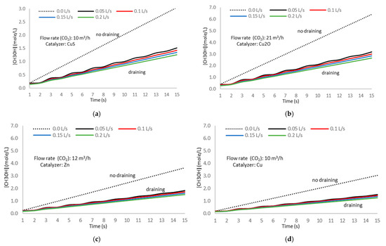 The obtained results show a fast increase in methanol formation when applying the draining process. Nevertheless, the flow rate does not significantly increase methanol production, as shown in the near horizontal section of methanol formation for the draining process.