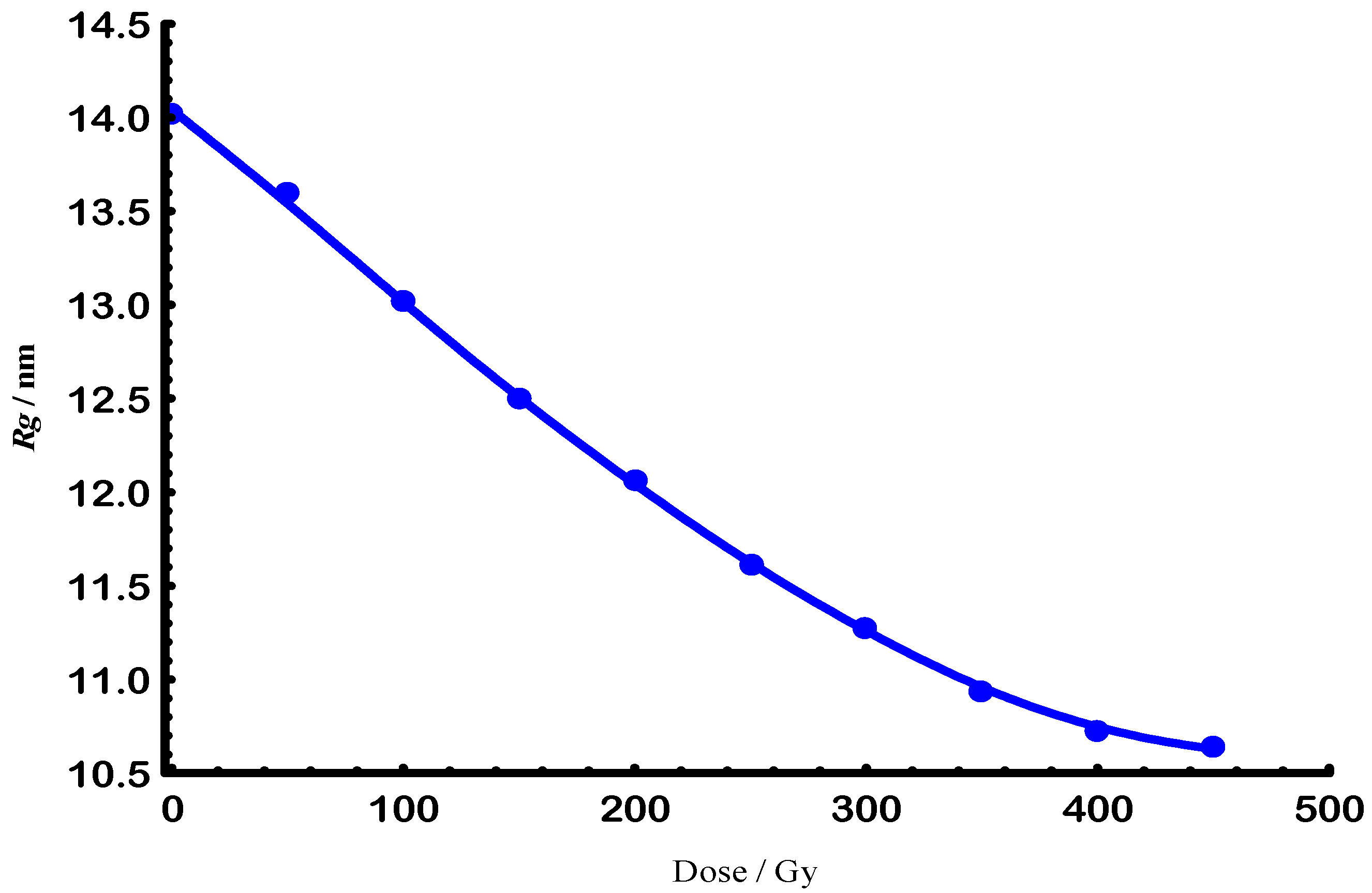 E-beam exponential decay of degraded radius of gyration for Gellan samples at 25 °C.
