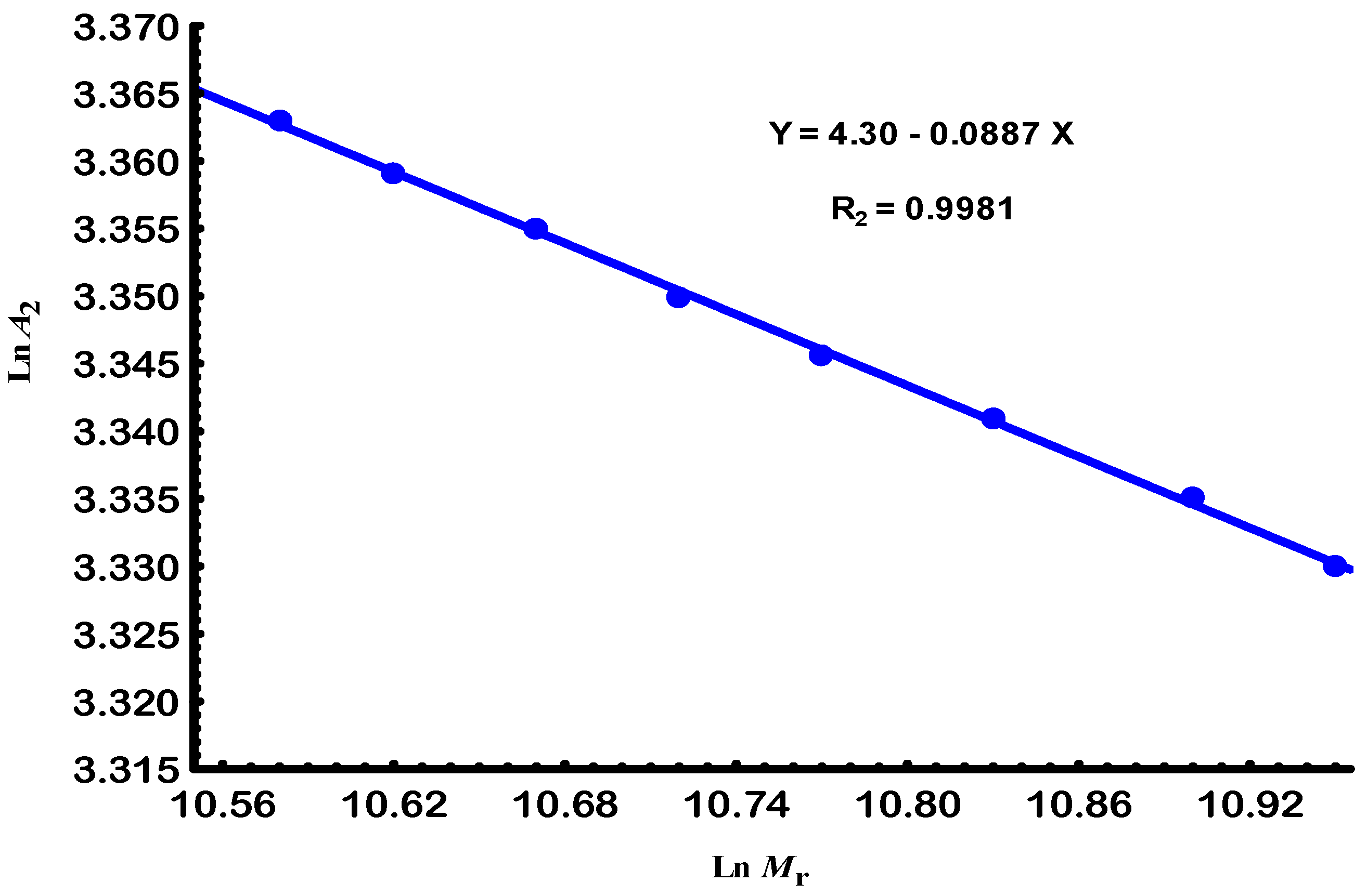 The linear relationship between the second virial coefficient and relative molar mass of Gellan samples at 25.