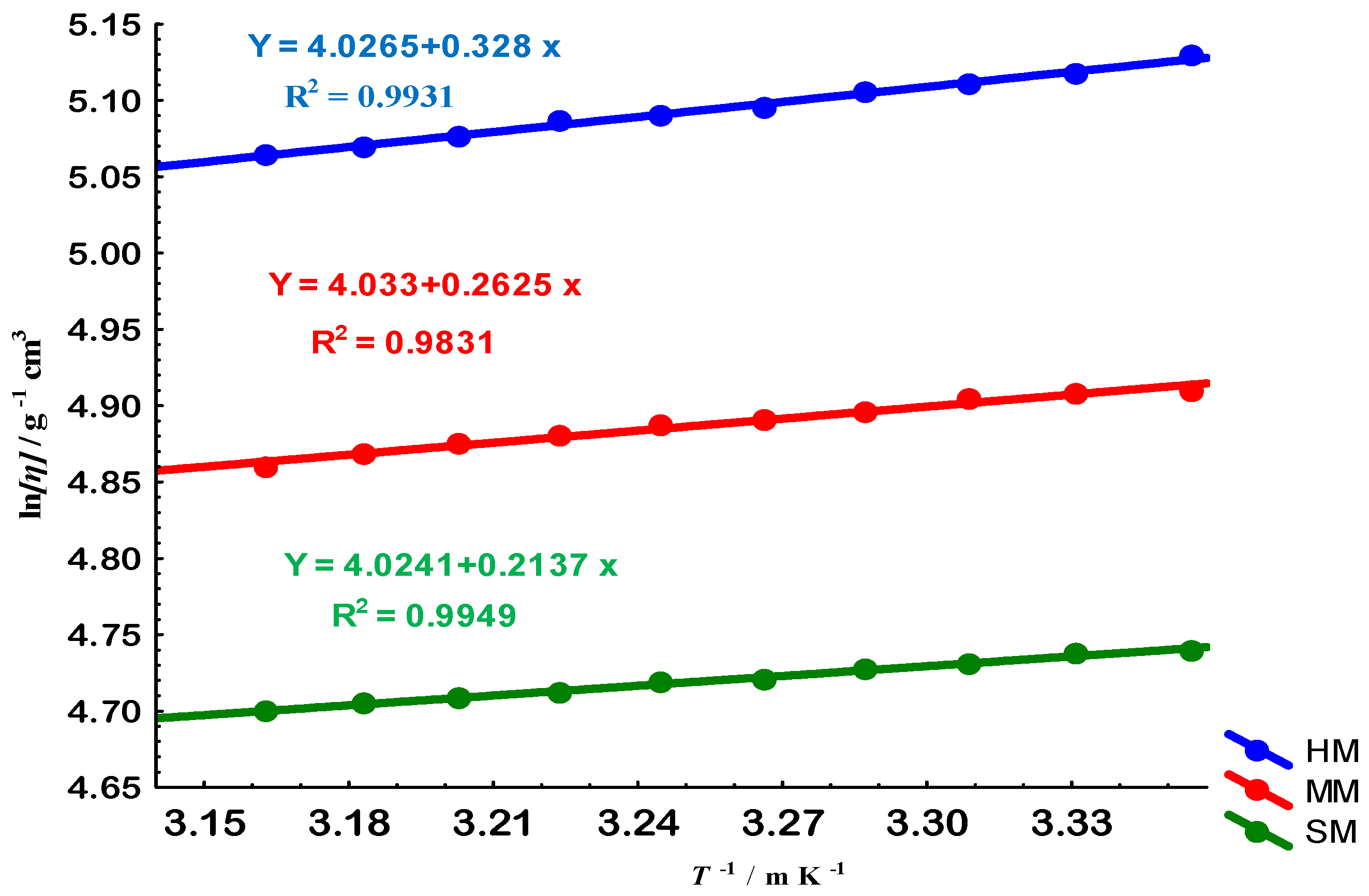Arrhenius-like plots for Gellan samples of high (HM, blue circles), medium (MM, red circles), and small (SM, green circles) molar masses. The y-axis represents the natural logarithm of viscosity () and the x-axis is the inverse of temperature (1/T). The solid lines represent linear fits to the data for each molar mass group, with the corresponding regression equations displayed. This plot is used to determine the flow activation energy (), which is proportional to the slope of the lines, revealing the temperature dependence of viscosity for the different Gellan fractions.