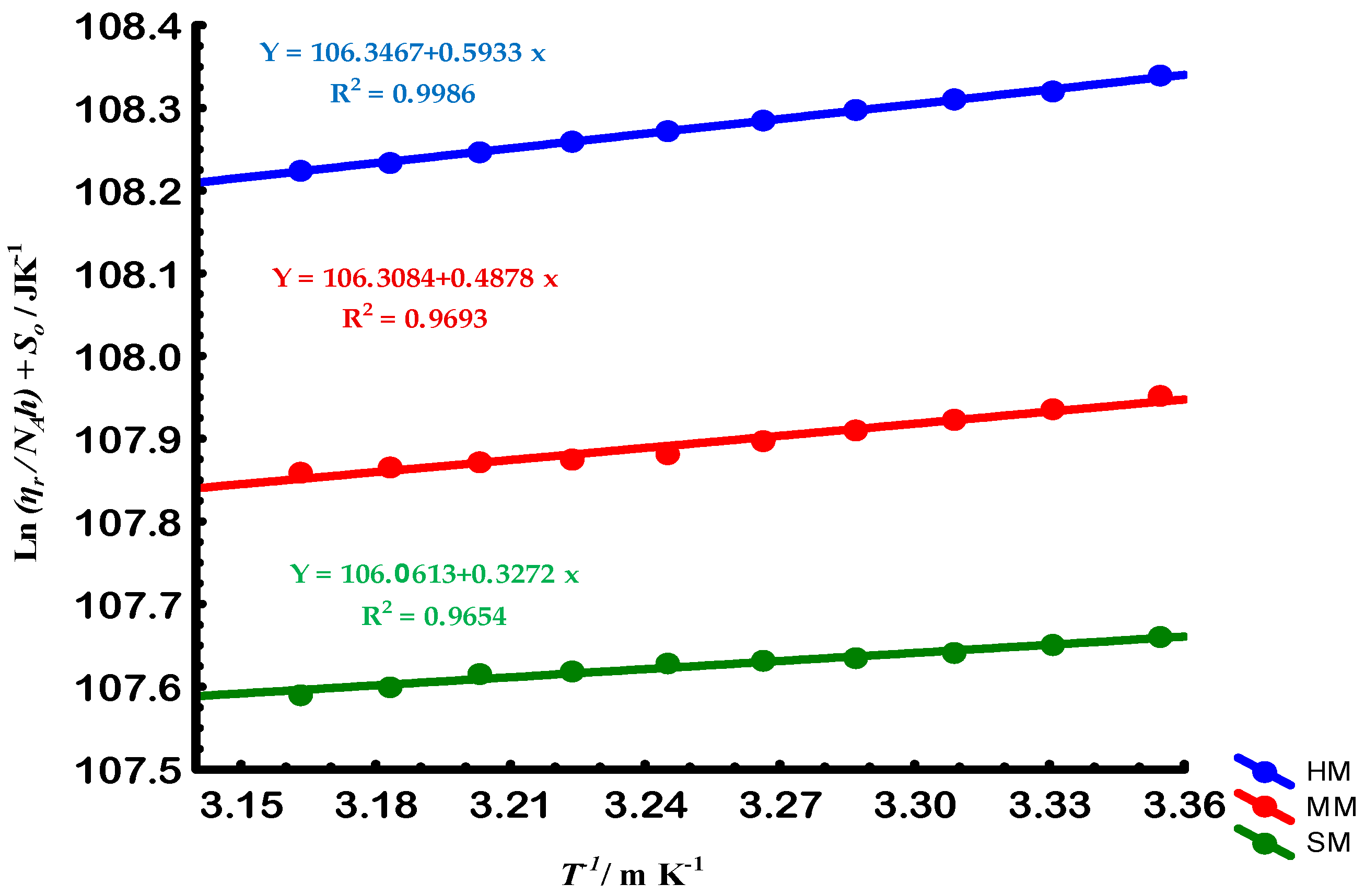 Kauzmann-Eyring plots for Gellan samples of high (HM, blue circles), medium (MM, red circles), and small (SM, green circles) molar masses. The y-axis represents the solvent entropy () plus (the natural logarithm of relative viscosity () divided by Avogadro’s constant () times Planck’s constant (h)), while the x-axis is the inverse of temperature (1/T). The solid lines represent linear fits to the data for each molar mass group, with the corresponding regression equations displayed. This plot illustrates the relationship between solvent entropy, molar mass, and temperature for the different Gellan fractions.