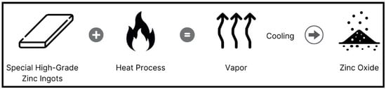 The production of industrial ZnO powder typically employs two major methods: the indirect (French process) and the direct (American process) methods. The “French process” is the most widely used, accounting for approximately 68–70% of total production, as it offers higher purity, faster processing, and greater output efficiency [12,13]. As illustrated in Figure 1, this process begins with pure zinc (Zn) in the form of plates or ingots, which are heated to temperatures above Zn’s sublimation point (around 907 °C). This causes Zn to convert directly from the solid to the vapor phase. The resulting zinc vapor (Zn2+) is then exposed to an oxygen-rich environment, where it reacts with oxygen (O2) in the air to form ZnO particles. These ZnO particles are subsequently cooled and collected as a commercial industrial powder, which generally consists of particles ranging from 0.1 μm to several micrometers, with larger agglomerates often forming during the process [13,14].