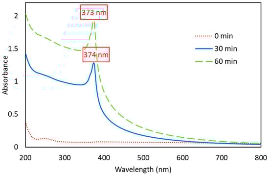UV-Vis absorbance spectral of fabricated ZnO-NPs with ultrasonication for 0, 30, and 60 min.