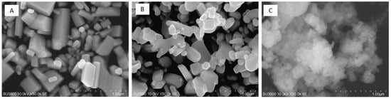 SEM images of ZnO-NPs produced with: (A) 30 min and (B) 60 min of ultrasonication, and (C) ZnO powder as bulk materials.